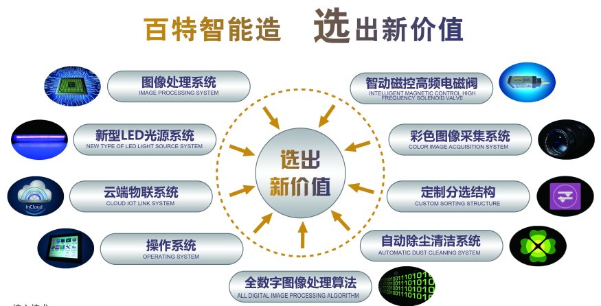 尤其在數字光電分選領域,百特光電以創新的技術、卓越的產品和配套解決方案堅持不懈地為客戶提供全面支持,并以出色的品質和值得信賴的可靠性、先進的技術成果、不懈的創新追求,在業界贏得良好聲譽。目前產品已廣泛應用于大米、雜糧、塑料、礦石、中藥、種子、豆類、堅果、茶葉等糧食和經濟作物的智能分選及配套服務,獲得顧客的廣泛好評。