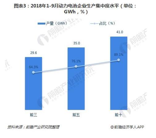 2018年1-9月,以寧德時代為首的前三名企業共計生產動力電池29.6GWh,占比64.3%;前五名企業共計生產35.0GWh,占比76.1%;前十名企業共計生產41.0GWh,占比89.1%。其中,9月份,我國動力電池產業產量排名前三名企業共計生產4.8GWh,占比68.6%,前五名企業共計生產5.4GWh,占比77.1%,前十名企業共計生產6.4GWh,占比91.4%。