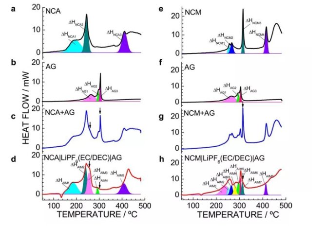 圖2 NCA和NCM體系鋰離子電池DSC分析結果。溫度范圍為25℃-480℃,升溫速率為5℃/min。所有樣品均含LiPF6 (EC/DEC)電解液。其中AG表示人造石墨(artificial graphite)。