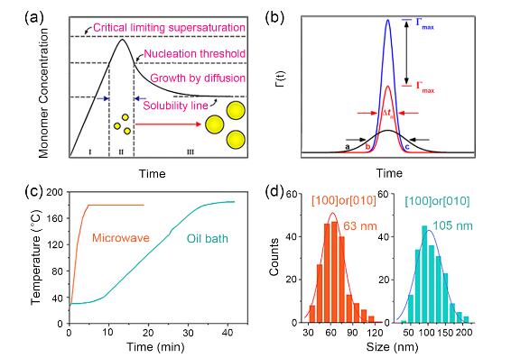 圖1 經(jīng)典的LaMer形核和生長機(jī)制以及實驗結(jié)果。(a)經(jīng)典LaMer機(jī)理,顆粒在溶液中成核和生長過程中單體濃度變化的示意圖。(b)三個具有高斯分布的形核函數(shù)。形核函數(shù)的寬度()對應(yīng)形核時間窗口。(c)微波加熱和油浴加熱兩種加熱模式下的原位溫度與時間曲線。(d)由兩種不同的加熱模式制備的LiFePO4沿[100]或[010]方向的尺寸統(tǒng)計。微波加熱的尺寸為63nm,而在常規(guī)油浴加熱的情況下,尺寸為105nm。