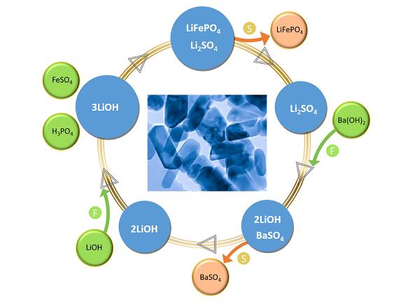 圖2 LiFePO4納米晶水熱合成路線及鋰回收示意圖。以LiOH、FeSO4和H3PO4為原料制備納米LiFePO4。用Ba(OH)2做沉淀劑與濾液反應(yīng),隨后進(jìn)行固液分離,回收LiOH。插圖為LiFePO4的TEM照片。