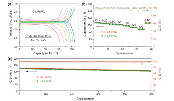 圖4 原始的O-LiFePO4/C和回收的R-LiFePO4/C的電化學(xué)性能曲線。(a)O-LiFePO4/C在0.1–10C不同倍率范圍內(nèi)的典型充放電曲線。(b)倍率性能。(c)O-LiFePO4/C和R-LiFePO4/C在3C倍率下的長循環(huán)穩(wěn)定性。3C對應(yīng)的充電或放電時間為20分鐘。