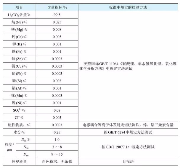 行業標準對電池級碳酸鋰的品質要求和檢測方法規定