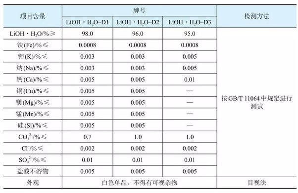 國標對電池級單水氫氧化鋰的品質要求和檢測方法規定
