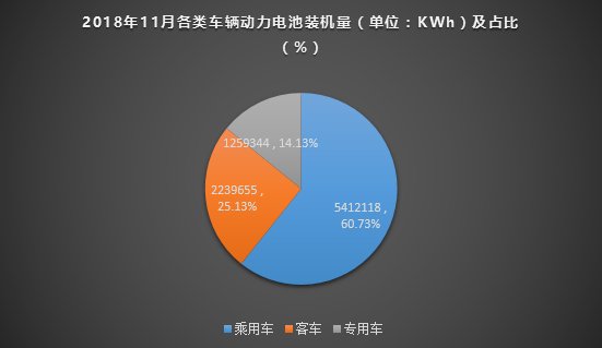從車輛細(xì)分類別來看,2018年11月,我國新能源乘用車動(dòng)力電池裝機(jī)量約為5.41GWh,占比60.73%,新能源客車動(dòng)力電池裝機(jī)量約為2.24GWh,占比25.13%,新能源專用車動(dòng)力電池裝機(jī)量約為1.26GWh,占比14.13%。