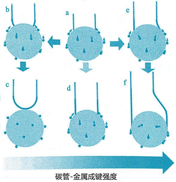 如果金屬催化劑原子與碳原子之間的作用力過大時,由于碳原子在催化劑表面的浸潤性較好,碳納米管的開口端就會沿著催化劑表面延展生長,表象上看就是談納米管的管徑存在被拉大的現象。這種情況下生長的碳納米管的管徑會隨著碳納米管長度的增加而增大,直到與金屬催化劑的直徑相當。上圖所示a→e→f即這個過程。