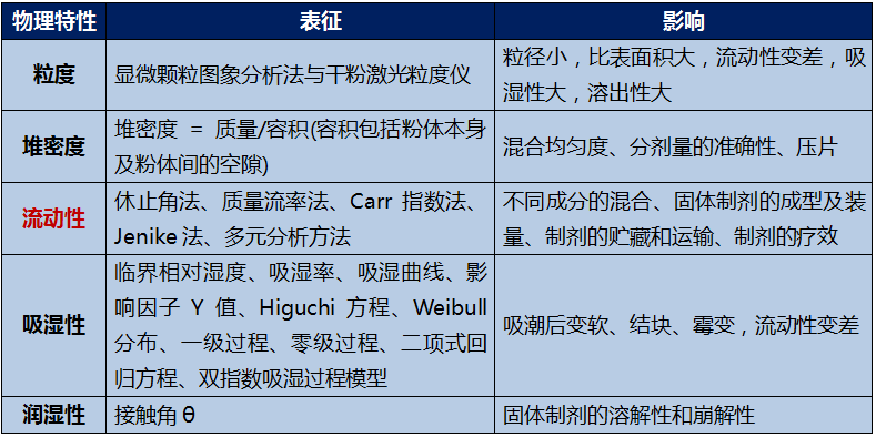 中國粉體網訊 在醫藥產品中固體藥物制劑約占 70%~80%,含有固體藥物的劑型有散劑、顆粒劑、膠囊劑、片劑、粉針、混懸劑等;涉及的單元操作有粉碎、分級、混合、制粒、干燥、壓片、包裝、輸送、貯存等。而這一系列過程密切相關的粉體性質有粒度、堆密度、流動性、吸濕性和潤濕性等。