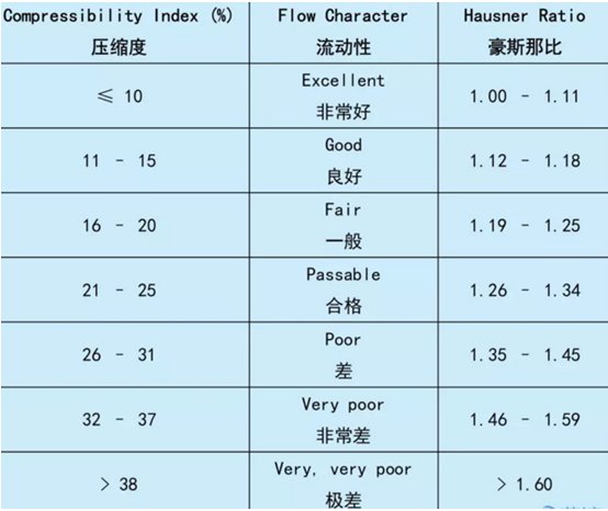壓縮度與豪斯那比及粉體流動性好壞的關系
