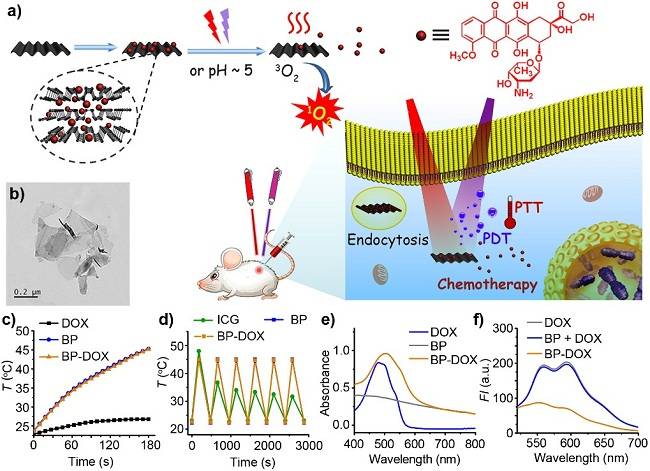 (a)黑磷納米片可以高效負載阿霉素,經細胞內吞進入腫瘤細胞,光照下可引發藥物的快速釋放,同時結合黑磷的光熱和光動力活性,實現三種模式聯合殺滅腫瘤細胞。