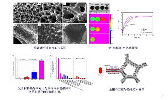 潛熱儲能通過材料發生相變時吸收或釋放大量熱量,實現能量的儲存和利用,可有效地解決能量供求在空間和時間上不匹配的矛盾,近年來已成為能源存儲和利用領域的研究熱點。但潛熱儲能材料普遍存在熱導率低、換熱性能差等缺點,極大限制了其廣泛應用和發展。該團隊首次將高質量泡沫金剛石引入到相變材料中,通過在石蠟相變材料中構建三維連通的金剛石快速導熱通道,將熱導率從0.25 W/mK提高到6.7W/mK,比石蠟提高了25.8倍。而且,與石墨、碳納米管、石墨烯等高導熱碳材料,泡沫金剛石無明顯的導熱各向異性,復合材料單位體積增強體對熱導率的貢獻值處于同領域領先水平。