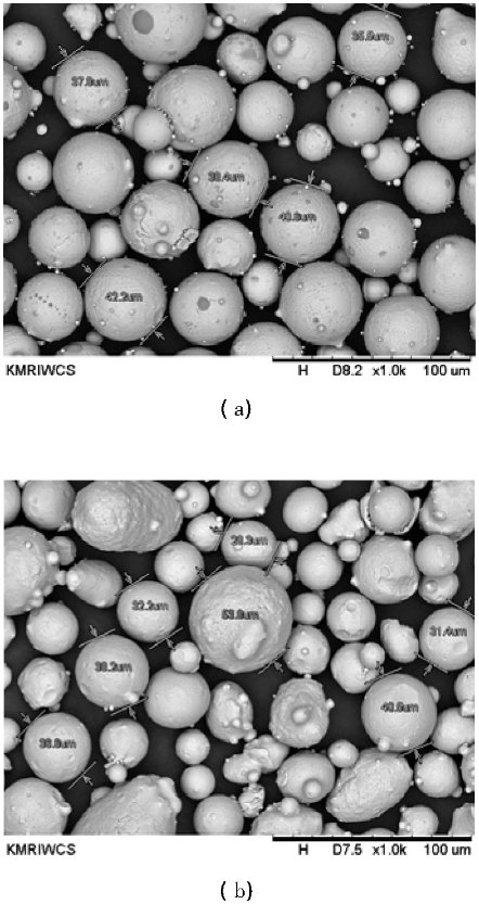 昆明冶金研究院通過對霧化噴嘴的改進, 在溫度1 800℃, 霧化壓力2.0MPa條件下, 采用氮氣霧化技術制備316 L不銹鋼金屬粉末, 并與德國EOS公司粉體形貌進行對比, 微觀結構情況見圖3。
