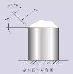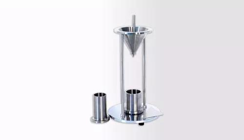 將測量量筒放到平臺上,將平臺調至水平,將阻塞棒插到漏斗中以堵住流出口,并保證阻塞棒處于直立狀態。將待測粉體裝滿盛樣量筒后全部倒入漏斗中,然后拔出阻塞棒,使粉體通過漏斗流出口流到測量量筒中,當粉體全部流出后取出測量量筒,用刮板刮平后放到天平上稱量。
