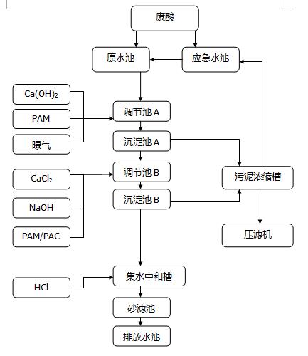 (7) 應急水池說明: 在非正常運行下,導致無法進行正常污水處理時,原廢酸溶液可直排應急水池,做過度使用池。另外,在廢酸處理的過程中,不達標廢水亦可以排入應急水池,做應急處理。
