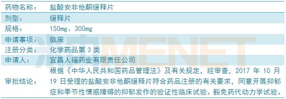 中國粉體網訊 近日,人福醫藥集團股份公司(簡稱:人福醫藥)控股子公司宜昌人福藥業有限責任公司(簡稱:宜昌人福)收到國家藥品監督管理局核準簽發的鹽酸安非他酮緩釋片的《臨床試驗通知書》。人福醫藥2018年6月20日披露鹽酸安非他酮緩釋片獲得美國FDA批準文號,累計研發投入約為130萬美元。