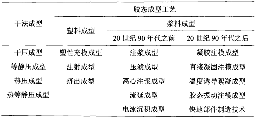 干法成型包括干壓成型、等靜壓成型、超高壓成型、粉末電磁成型等方法。濕法成型大致可分為塑性成型和膠態澆注成型兩大類。塑性成型也稱濕壓法,是指將已制成塑性的物料在剛性模具中壓制成型的一種成型方法,包括擠壓成型、注射成型、軋膜成型(壓延成型)等幾種。膠態澆注成型是將具有流動性的漿料制成可自我支撐形狀的一種成型方法。該法利用漿料的流動性,使物料干燥并固化后得到一定形狀的成型體。主要包括注漿成型、注凝成型、流延成型、直接凝固成型、膠態振動注模成型等。
