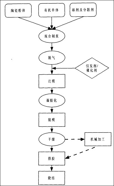 優點:不需或只需少量的有機添加劑(小于1wt%),坯體不需脫脂,坯體密度均勻,相對密度較高,而且可成型大尺寸復雜形狀的陶瓷部件。