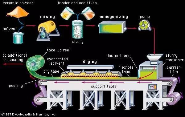 流延成型是指在陶瓷粉料中加入溶劑、分散劑、粘結劑、增塑劑等成分,得到分散均勻的穩定漿料,在流延機上制得所要求厚度薄膜的一種成型方法。