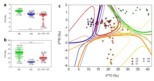 (a)Si同位素指紋;(b)O同位素指紋;(c)Si-O二維同位素指紋及機(jī)器學(xué)習(xí)分類模型(簡(jiǎn)寫:ND:天然硅藻土;NQ:天然石英;ES:人造溶膠凝膠法SiO2;EP:人造沉淀法SiO2;EF:人造氣相法SiO2)