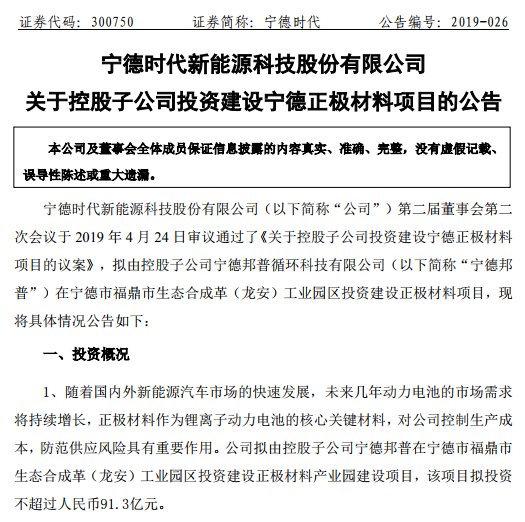 寧德時(shí)代表示未來(lái)幾年動(dòng)力電池的市場(chǎng)需求將持續(xù)增長(zhǎng),正極材料作為鋰離子動(dòng)力電池的核心關(guān)鍵材料,對(duì)公司控制生產(chǎn)成本,防范供應(yīng)風(fēng)險(xiǎn)具有重要作用。故擬投資不超過(guò)人民幣91.3億元由控股子公司寧德邦普循環(huán)科技有限公司(以下簡(jiǎn)稱(chēng)“寧德邦普”)在寧德市福鼎市生態(tài)合成革(龍安)工業(yè)園區(qū)投資建設(shè)正極材料產(chǎn)業(yè)園建設(shè)項(xiàng)目。項(xiàng)目為年產(chǎn)10萬(wàn)噸鋰離子電池三元正極材料鎳鈷錳酸鋰(含正極材料三元前驅(qū)體10萬(wàn)噸)。項(xiàng)目用地面積約750畝,分兩期建設(shè),總體建設(shè)期為五年。