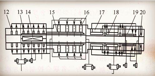 12.排濕孔;13.煙氣排出孔;14.換熱器;15.隔煙道;16.燃燒室;17.間接急冷;18.間接冷卻;19.金屬管冷卻;20.直接冷風送入