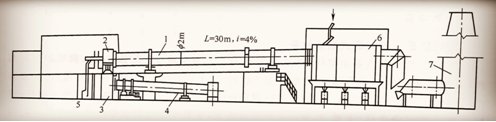 1.回轉窯窯體;2.窯頭小車;3.熱煙室;4.冷卻筒;5.窯頭鼓風機;6.集塵室;7.煙囪