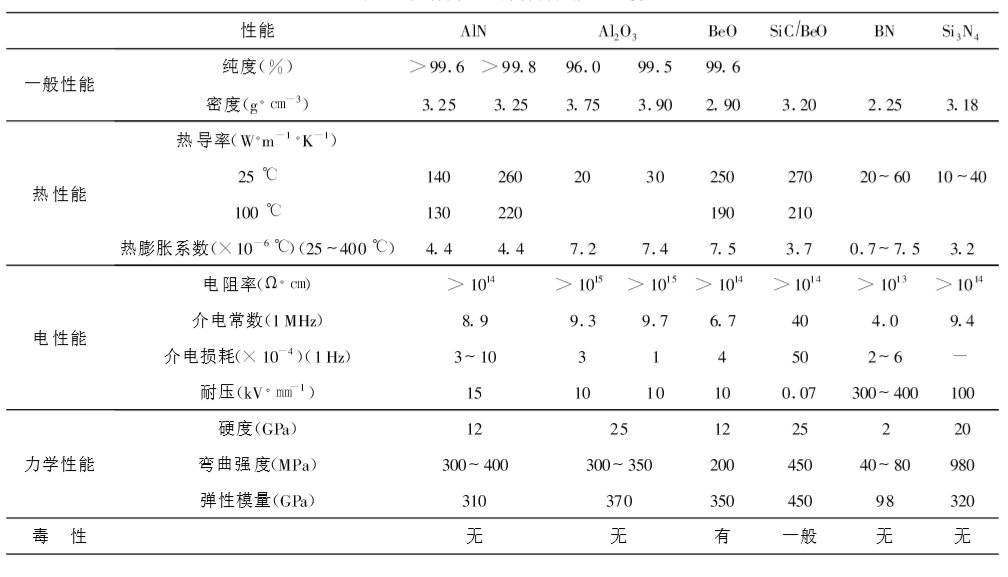 幾種陶瓷基片材料性能比較