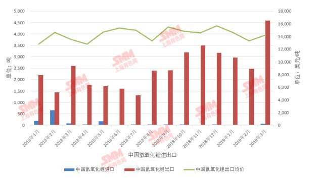 中國粉體網訊 2019年第一季度,中國碳酸鋰進口量為3,316噸,同比下降57%,環比下降19%。出口量為4,809噸,同比增長432%,環比上漲11%。其中,3月份碳酸鋰出口量為2,897噸,環比增長132%。另一方面,2019年第一季度,中國氫氧化鋰進口量為78噸,同比下降92%,環比下降13%。出口量為10016噸,同比上漲61%,環比增長2%。其中,3月份氫氧化鋰出口量為4,582噸,環比增長86%。