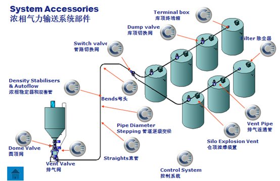 濃相氣力輸送系統可將物料從一個或多個集料點輸送到一個或多個接收點,可輸送各種類型的粉體物料,如粉末,顆粒,混合料等各種松散的固體物料。