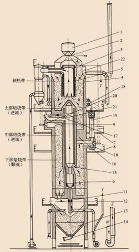 1.料斗;2.料口;3.加料斗;4.外筒;5.上內(nèi)筒;6.下內(nèi)筒;7.上燒嘴平臺;8.下燒嘴平臺;9.上燃燒室;10.下燃燒室;11.液壓推桿系統(tǒng);12.出料臺;13.石灰倉;14.振動出料機(jī);15.循環(huán)氣體入口;16.拱橋;17.冷卻梁;18.環(huán)形管道;19.噴射器;20.燒嘴;21.循環(huán)氣體管道;22.環(huán)形煙道。