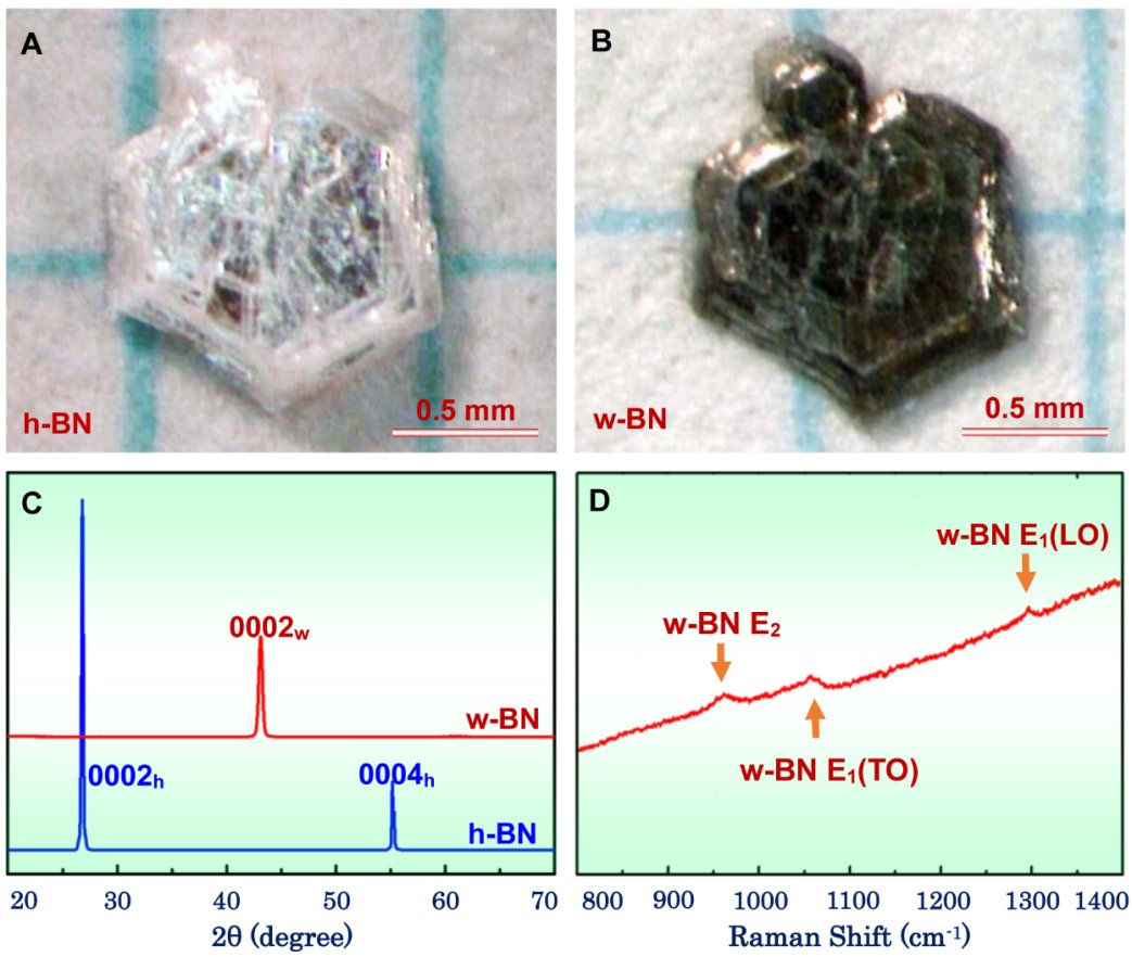 纖鋅礦型氮化硼是硬度接近于金剛石的超硬材料,有望在許多應用領域中替代金剛石。此外,纖鋅礦型氮化硼還是一種很有前景的寬帶半導體,具有比氮化鎵更寬的能隙、更高的導熱性等優點,有望在高性能電子器件中得到應用。然而,纖鋅礦型氮化硼是一種高壓亞穩相,在常壓下極易轉變為六角氮化硼(具有類似于石墨的結構),通常僅能通過沖擊波壓縮法制備微米尺寸的纖鋅礦型氮化硼。目前,如何制備較大尺寸的纖鋅礦型氮化硼并使其在常溫常壓下保持穩定的相關機理尚不清楚。