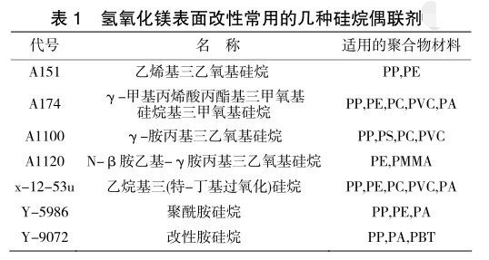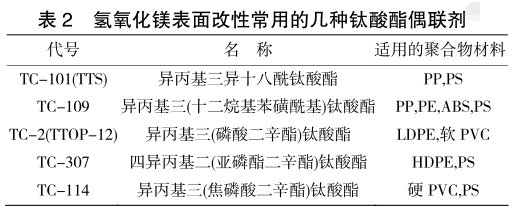 偶聯劑改性是偶聯劑與超細粉體表面發生化學偶聯反應,兩組分之間除了范德華力、氫鍵或配位鍵相互作用外,還有離子鍵和共價鍵的結合。偶聯劑分子必須具備兩種基團:能與無機納米粒子進行反應的極性基團和與有機物具有反應性或相容性的基團。通過偶聯劑處理,高表面能的納米粒子與低表面能的有機體有較好的親和性。根據中心原子的不同,可將偶聯劑分為硅烷偶聯劑、鈦酸酯偶聯劑、鋁酸酯偶聯劑、鋯酸酯偶聯劑、鋯鋁酸鹽偶聯劑、鋁鈦復合偶聯劑等。表1是氫氧化鎂表面改性常用的幾種硅烷偶聯劑。表2是氫氧化鎂表面改性常用的幾種鈦酸酯偶聯劑。