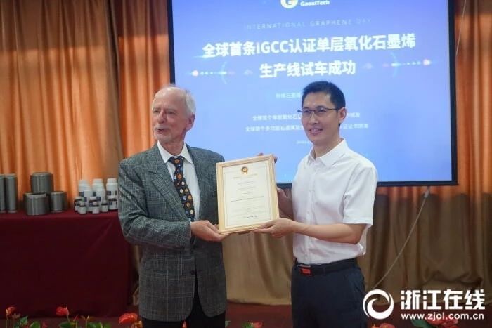 國際石墨烯認證中心Werner Bergholz博士為企業(yè)頒發(fā)證書(來源:浙江在線)