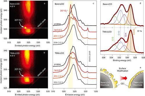 圖3. 共振非彈性X射線散射(RIXS)結果表明Ti、Mg、Al摻雜LiCoO2材料充電至高電壓狀態時氧離子的氧化活性被抑制,使得材料具有更穩定的表面