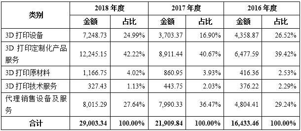 鉑力特近年經(jīng)營(yíng)業(yè)績(jī)一直保持著良好態(tài)勢(shì),財(cái)務(wù)數(shù)據(jù)顯示,西安鉑力特2016~2018年的產(chǎn)品銷售收入分別為1.6億元、2.2億元、2.9億元。綜合其近3年銷售情況來看,3D打印定制化產(chǎn)品服務(wù)、代理銷售設(shè)備及服務(wù)、3D打印設(shè)備三項(xiàng)業(yè)務(wù)構(gòu)成公司主要收入來源,銷售收入占比在94%~95%左右。