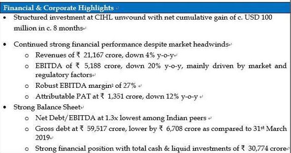 中國粉體網訊 韋丹塔(Vedanta Ltd)7月26日公布了截止6月30日的第一季度財報(2019年4月-6月),報告顯示該季度營收為2116.7億盧比(約30.7億美元),同比下降4%。稅后利潤(PAT)為135.1億盧比(約合1.96億美元),同比下降12%。