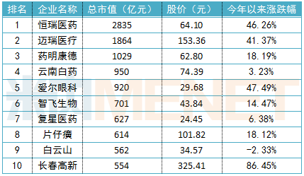 2017年11月在A股市場(chǎng),曾一度出現(xiàn)恒瑞醫(yī)藥、康美藥業(yè)、云南白藥、上海萊士、華大基因、復(fù)星醫(yī)藥6只千億市值醫(yī)藥股的“鼎盛時(shí)期”。目前,除了恒瑞醫(yī)藥、邁瑞醫(yī)療和藥明康德外,云南白藥、愛(ài)爾眼科等均有望躋身千億市值行列。