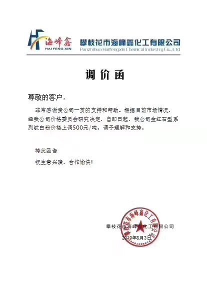 8月3日,攀枝花市海峰鑫化工有限公司發(fā)布調(diào)價函稱,根據(jù)目前市場情況,經(jīng)我司價格委員會研究決定,自即日起,我公司金紅石型系列鈦白粉價格上調(diào)500元/噸。