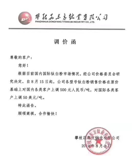 8月5日,攀枝花東方鈦業(yè)有限公司發(fā)布調(diào)價函稱,根據(jù)目前國內(nèi)鈦白粉市場情況,經(jīng)公司價格委員會研究決定,自8月15日起,公司各型號鈦白粉銷售價格在原價基礎(chǔ)上對國內(nèi)各類客戶上調(diào)500元人民幣/噸,國際各類客戶上調(diào)50美元/噸。