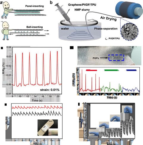 為解決上述問題,中國科學院上海微系統與信息技術研究所研究員丁古巧課題組提出了通過結構化設計減少石墨烯與高分子接觸面積來提高靈敏度的策略。他們利用石墨烯/聚偏氟乙烯/聚氨酯DMF體系在水相的相分離過程,制備了高分子納米球修飾的石墨烯多孔網絡纖維,這種結構大幅增強了該纖維在發生形變時石墨烯片層之間的結構變化,從而實現石墨烯基纖維靈敏度的顯著提高。其靈敏度因子值在0-5%應變時為51,在5-8%應變時達到87,通過編織集成,他們進一步驗證了該纖維在人體重要信號收集的準確性和對不同動作狀態分析的可行性。同時,這種新型石墨烯基纖維傳感器最低形變檢測限達到0.01%,較好的應變-電阻線性關系可保證在信號后處理上的準確性,>6000次的循環壽命有利于實際應用的穩定性。