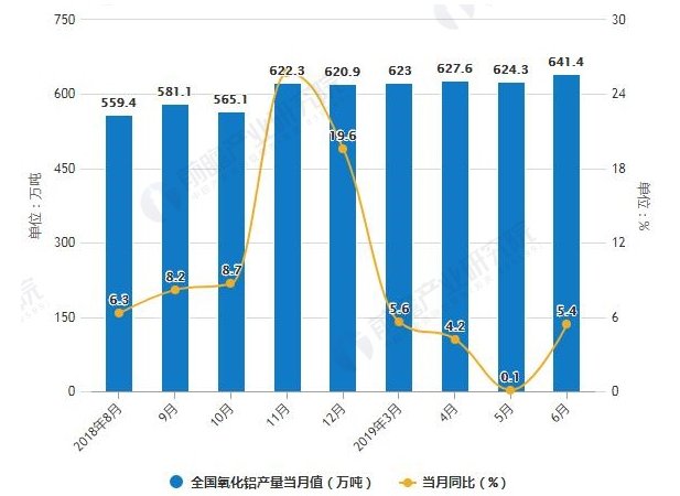 2018-2019年6月全國氧化鋁產量統計及增長情況