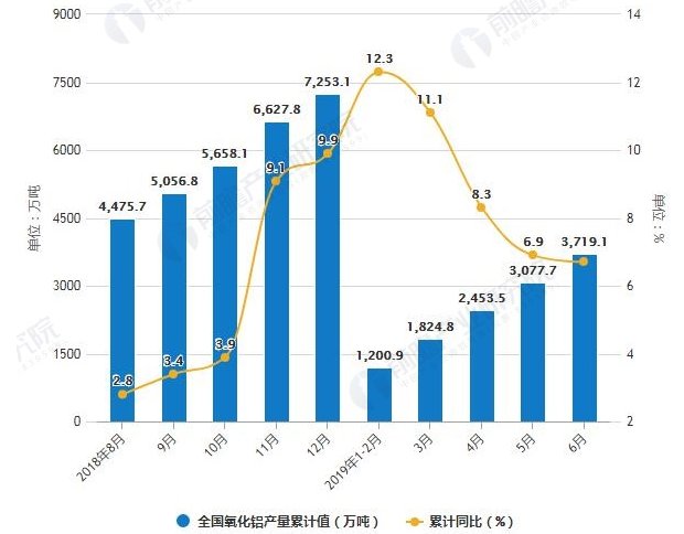 據公開統計數據顯示,2018年全年全國氧化鋁產量高達7253.1萬噸,累計增長9.9%。截止至2019年6月全國氧化鋁產量為641.4萬噸,同比增長5.4%。累計方面,2019年1-6月全國氧化鋁產量達到3719.1萬噸,同比增長6.7%。