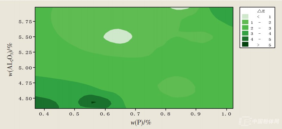 圖1 磷鋁包膜樣品△E與包膜劑含量的等值線圖