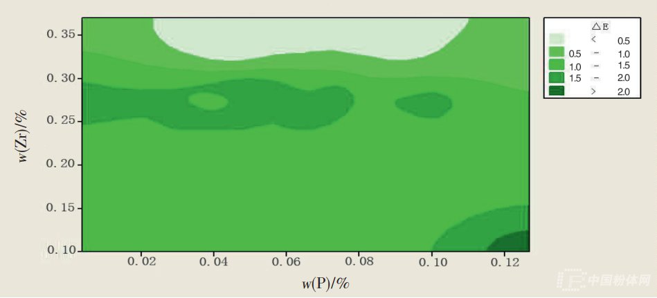 圖2 磷鋯包膜樣品△E與包膜劑含量的等值線圖
