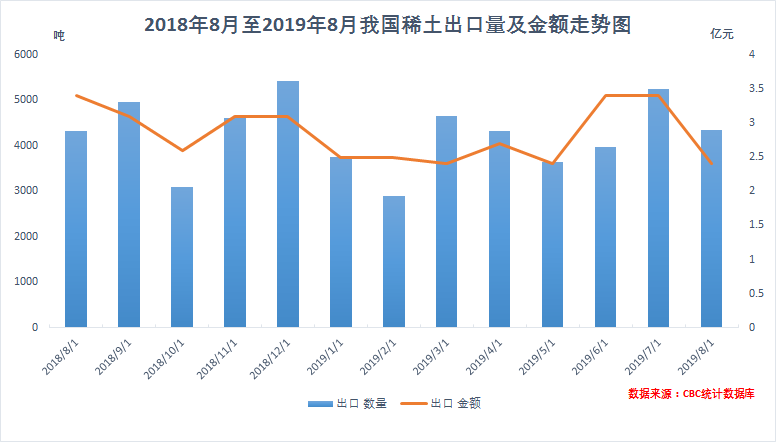 中國粉體網訊 海關數據顯示,2019年8月份我國稀土出口數量4351.9噸,環比減少17%,而1-8月份累計32827.5噸,累計與2018年同期減少6.3%。