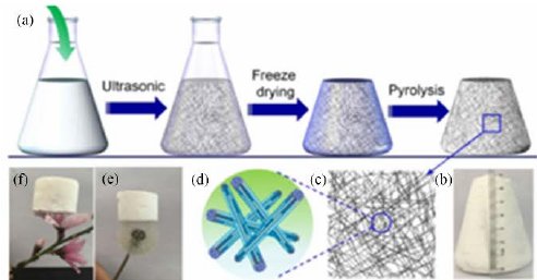Su等人通過化學(xué)氣相沉積的方法制備碳化硅納米線片層材料,然后將纖維片層逐層疊加,制備了碳化硅納米線氣凝膠。該材料不僅有較好壓縮回彈性能還有良好的阻燃性和隔熱性能。但該方法制備的氣凝膠僅是二維結(jié)構(gòu)的簡單堆疊,呈各向同性,且片層間無相互作用,易出現(xiàn)層間剝離限制其實(shí)際應(yīng)用。