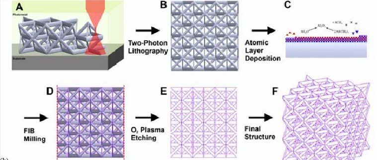 Meza等人利用雙光子刻蝕、原子層沉積和氧等離子體刻蝕制備氧化鋁陶瓷空心管三維微米格子框架。該材料可以通過優(yōu)化管壁厚度與半徑比值可以抑制構(gòu)成固體的脆性斷裂,通過殼屈曲達(dá)到彈性形變,從而優(yōu)化框架的回彈性能。但該法成本過高,擴(kuò)大化生產(chǎn)困難。