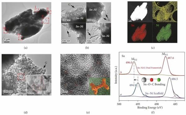 其中,Sn–Ni合金框架與三維石墨烯高度均勻分布,且無定形合金表面氧化物組分有利于兩者之間形成強烈的Sn–O–C鍵,進一步增強儲能應用中的協同作用(圖2)。