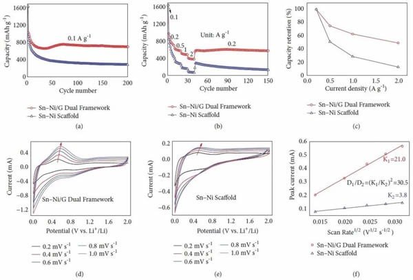 作為鋰離子電池負極,雙框架結構具有優異的穩定性和混合離子傳輸通道,同時,界面Sn–O–C鍵進一步穩定結構并加速電荷傳輸,因此,該Sn–Ni/G雙框架材料表現出了良好的循環穩定性和倍率特性(圖3)。在0.1 A/g的充放電速率下經過200次循環,其可逆比容量高達701 mAh/g;在1 A/g的大速率下,其平均比容量仍高達497 mAh/g。