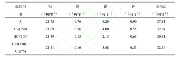 婁陳林,張國君(湖北菲利華石英玻璃股份有限公司)等采用高溫氯化工藝進行石英砂提純試驗,結果表明,干燥HCl、干燥Cl2或干燥Cl2/HCl混合氣體均對Na、Fe、K等金屬雜質有明顯純化效果,其中干燥HCl氣體的提純效果最好。