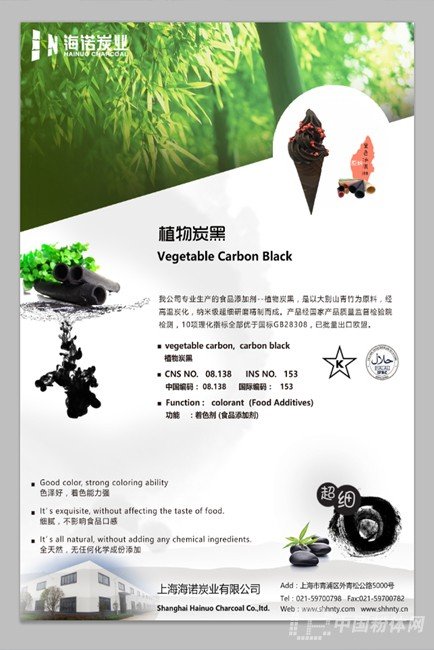 上海海諾炭業(yè)有限公司是生產(chǎn)植物炭黑食品添加劑的源頭廠家,是國(guó)家特種超細(xì)粉體工程技術(shù)中心上海超細(xì)炭粉產(chǎn)業(yè)化實(shí)驗(yàn)基地,有自營(yíng)進(jìn)出口權(quán)和自主知識(shí)產(chǎn)權(quán),擁有上海、安徽兩個(gè)生產(chǎn)基地。海諾HN-VCB系列植物炭黑,是以大別山青竹為原料,經(jīng)高溫炭化,納米級(jí)超細(xì)研磨精制而成。產(chǎn)品經(jīng)國(guó)家產(chǎn)品質(zhì)量監(jiān)督檢驗(yàn)院檢測(cè),10項(xiàng)理化指標(biāo)全部?jī)?yōu)于國(guó)標(biāo)GB28308,已批量出口歐盟。能夠賦予糖果、糕點(diǎn)、粉圓、餅干、冷凍飲品等靚麗的黑色,改善食品感官。